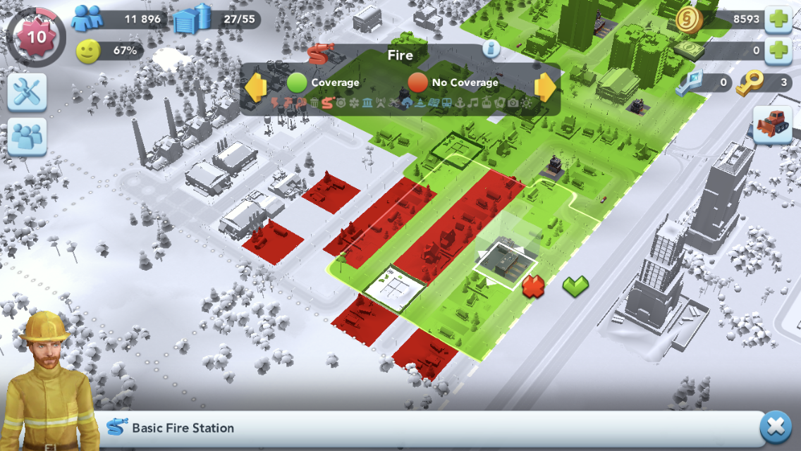 그림2는 심시티에서 소방서를 지어야 하는 상황으로 빨간색은 근처에 소방서가 없어서 빨리 소방서를 지어 커버를 하라는 신호이다.