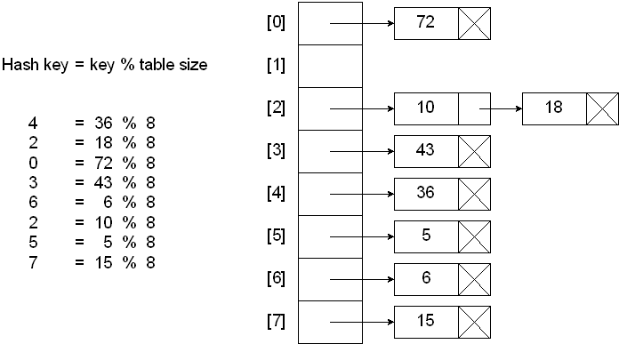 위 그림을 보면 18과 10키에 대해 modular hash funciton 적용시 버킷 index 는 둘다 2이다.