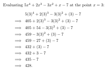 예를들어 5x4 + 2x3 – 3x2 + x – 7 가 있고 x = 3이라고 하면 그림2처럼 계산되고 결과 값은 428이 된다.