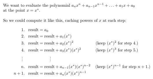 결론적으로 호너의 법칙을 사용하여 다항식을 계산하면 n차수(n-degree)의 다항식에서 필요한 덧셈과 곱셈의 횟수는 그림 8처럼 된다.