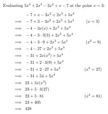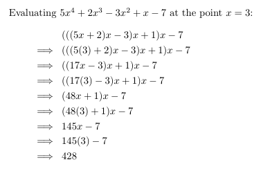 호너의 법칙은 그림 5의 아래등식처럼 기존의 다항식과 동일하게 재 작성할수 있게 되고 재작성된 식으로 다항식을 계산한다면 n차수 다항식에서 n 곱셈과 n 덧셈만으로 차수 n의 다항식을 평가할 수 있게 된다.