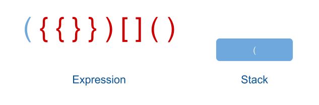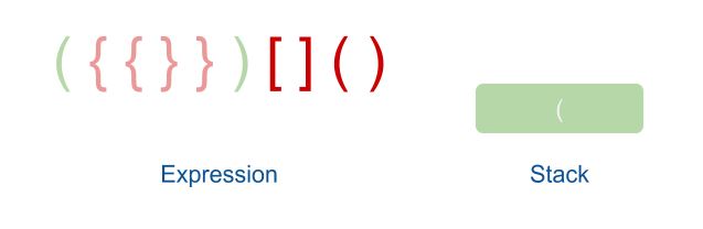 열린 괄호 ( ex. (, { . [ ) 가 나오면 무조건 스택에 push 해준다. 예제에서 처음 문자는 ( 이므로 현재 스택에 ( 가 들어가 있다.