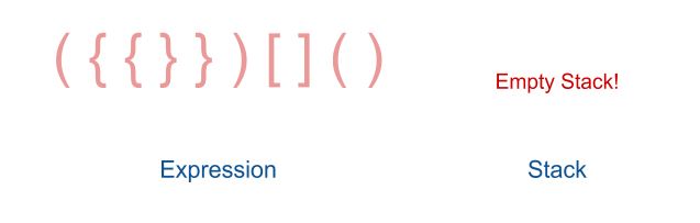 이런식으로 나머지도 쭉 비교하다가 매칭되지 않으면 invalid 한 것이고 균형잡힌 괄호 표현식이라면 최종적으로 스택은 빈상태(empty)가 되어야 한다.