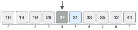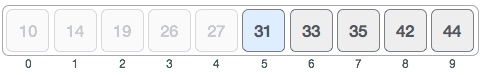위와 같이 list = { 10, 14, 19, 27, 31, 33, 35, 42, 44 } 가 있고 이진검색을 통해 31을 찾는다고 하자.