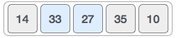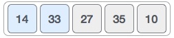 버블소트는 처음 2개의 원소(numbers[0], numbers[1])를 비교한다. 비교해서 만약 첫번째 원소가 두번째 원소보다 크다면 서로 위치를 swap(교환) 한해야 다. 하지만 14는 33보다 작으므로 swap 할 필요가 없다.