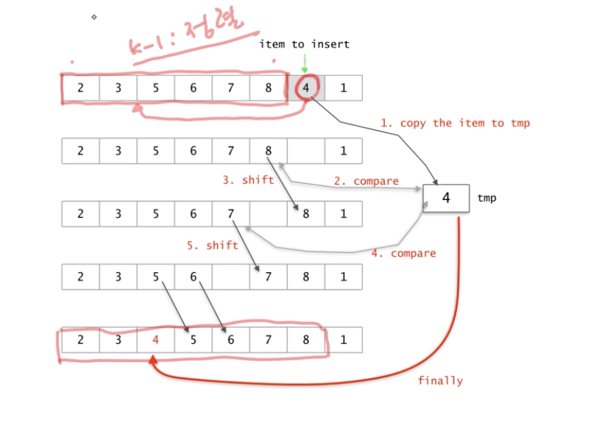 아이템 4를 k-1 정렬된 서브리스트(sorted sub-list)에 추가(insert)될 위치를 구하기 위해서 정렬된 서브리스트의 맨 끝(8)부터 하나씩 비교하면서 자신보다 작은 값(3)이 나타날 때까지 한칸식 쉬프트하여 최종적으로 4가 들어갈 자리를 얻게 되는 것이다.
