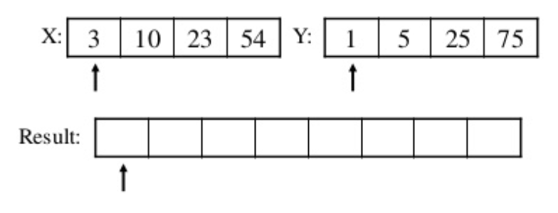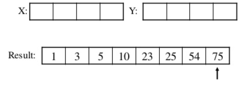 이렇게 계속 비교해가면서 X, Y 의 비교 위치를 이동하고 Result 값을 채워 나가면 결국엔 Result 의 모든 원소는 정렬된 상태로 되고 2개의 배열의 병합(merge)이 끝나게 된다.