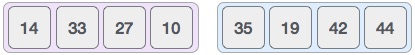 그 다음 19와 35의 순서를 바꾸는 반면 42와 44는 순차적으로 나열하여 병합하면 첫 번째 병합을 위한 단계가 끝난다.