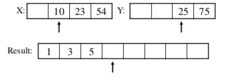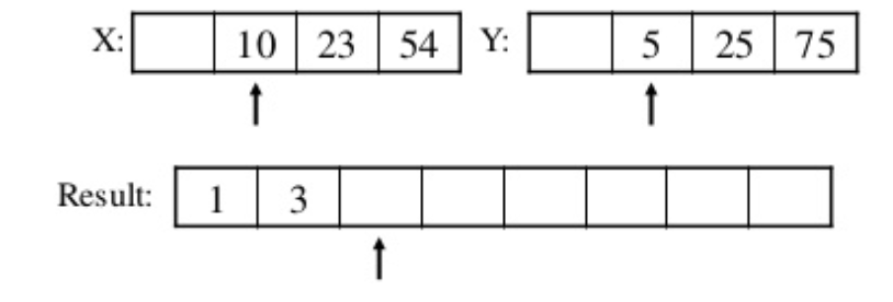둘중에 1이 더 작기 때문에 Result 첫번째에 1이 들어갔고 이제 다음 비교를 위해 Y배열의 비교 위치를 한칸 뒤로 이동한다.