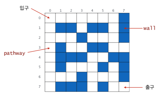 그림2와 같은 8X8 미로가 있다고 하자 입구에서 출구까지 가는 경로를 찾는 문제이다.