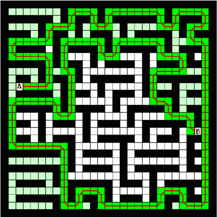 미로(MAZE)찾기란 그림 1 처럼 출발지 (A)에서 도착지 (B)까지 가는 경로를 알고리즘적으로 푸는 방법이다.
