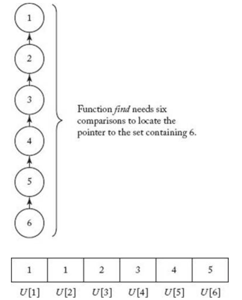 이렇게 되어 있으면 7이 어느 집합의 루트노드에 있는지 find 하는 알고리즘은 U[7] = 4 ▷ U[4] = 2 ▷ U[2] = 2 (self number) 까지 올라가면 S2에 속해 있다는것을 알수 있게 되는것이다.
