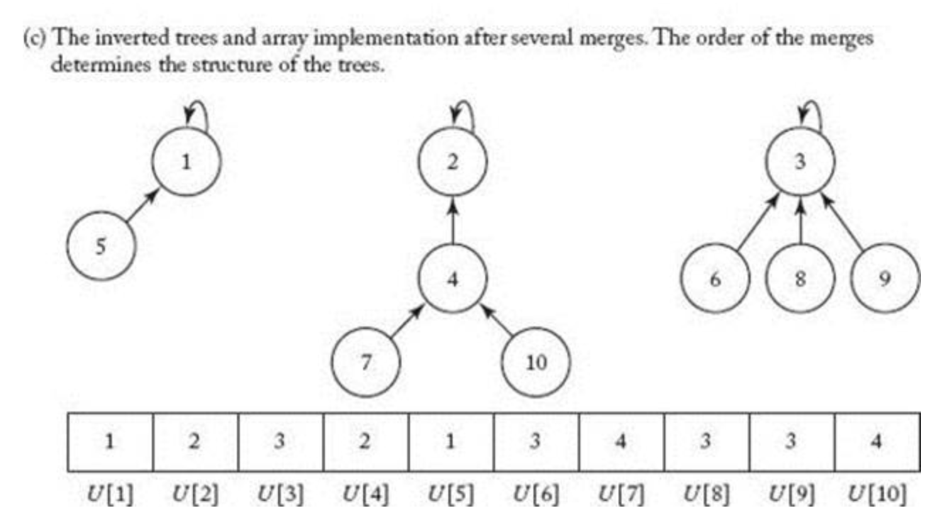 이진트리도 노드 or 배열로 표현가능한것처럼 서로수집합 구현은 트리로 구성되서 뭔가 트리자료구조 처럼 노드가 연결된 것처럼 구현할 수 도있 지만 UNION-FIND만 있으면되기 때문에 배열로도 표현가능하다.