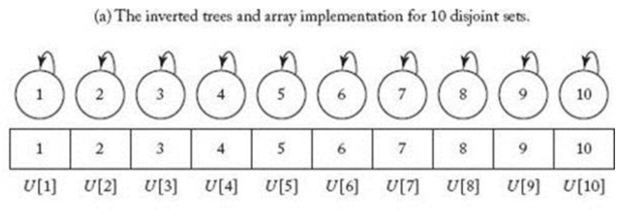 하지만 처음 각 집합은 하나의 원소들만 가지고 있고 자기자신이 원소이면서 루트로드이기 때문에 배열 U[1] .. U[10]까찌 self 넘버가 들어가있다.